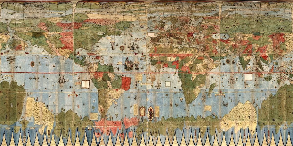 Nejzajímavější je však centrální mapa celého tehdy známého světa. Mapa velkého měřítka také zobrazuje jinou geografii. Antarktida je zobrazena bez ledu a zeleně. Přitom tento kontinent měl být objeven a prokázán až v roce 1820. Proč není zobrazen současný led na Antarktidě, není jasné, ale jak vidno, v 16. stol. už věděli s jistotou, že se tam tento kontinent nachází. Jižní Amerika a Antarktida jsou na této mapě odděleny úzkým průlivem.